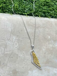 Celebrate heritage with the Palestine Calligraphy Necklace – 925 Sterling Silver. Featuring elegant Arabic calligraphy and a map motif, this piece honors culture and identity. Available in silver or 18K gold plated finish. Shipped from Jordan to the USA, KSA, UAE, Canada, and the Gulf area.